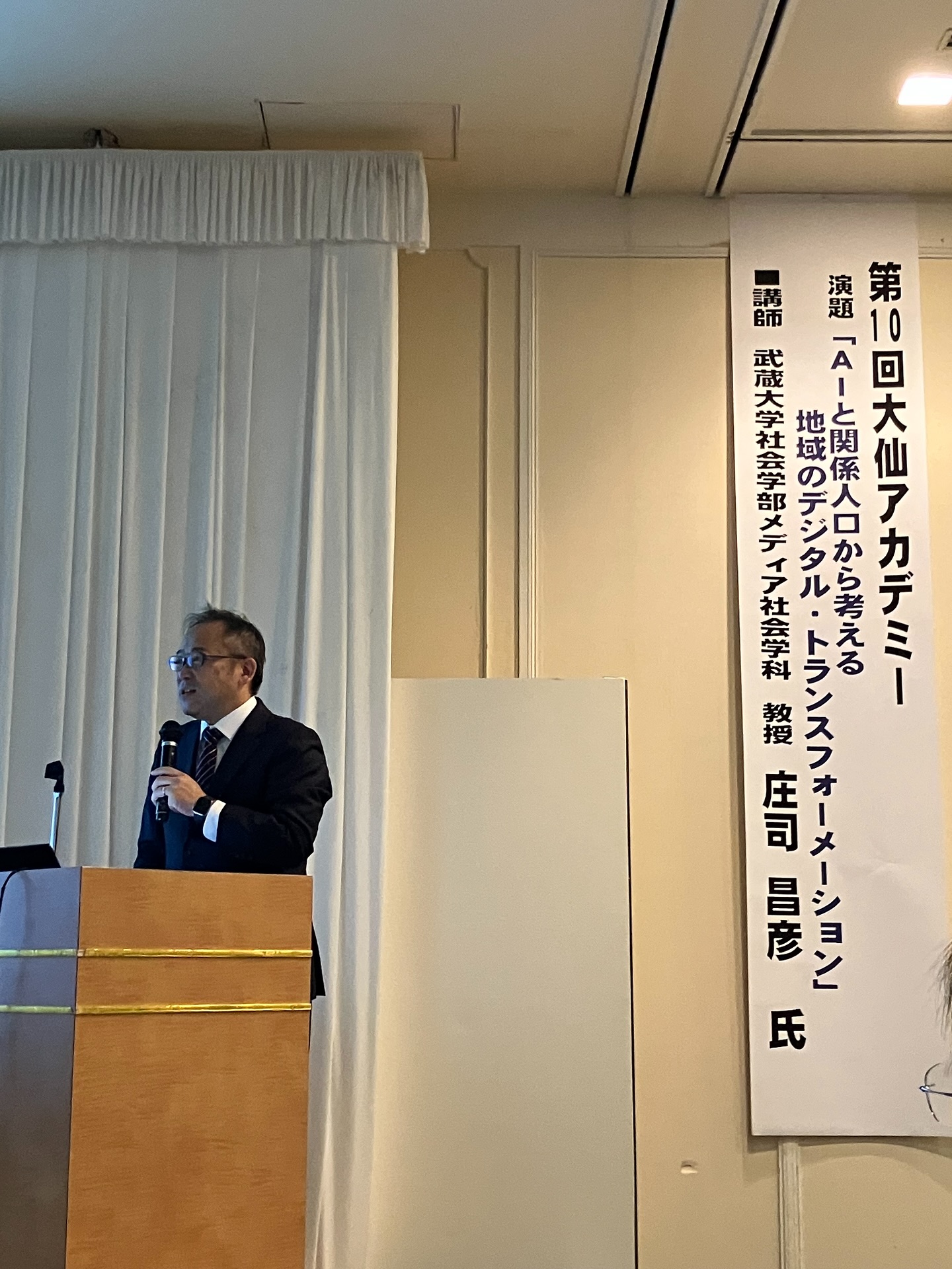 第10回 大仙アカデミーがグラントパレス川端で行われました。武蔵大学社会学部メディア社会学科の庄司昌彦教授を講師にお招きして、「AIと関係人口から考える地域のデジタル・トランスフォーメーション」の講演が行われました。