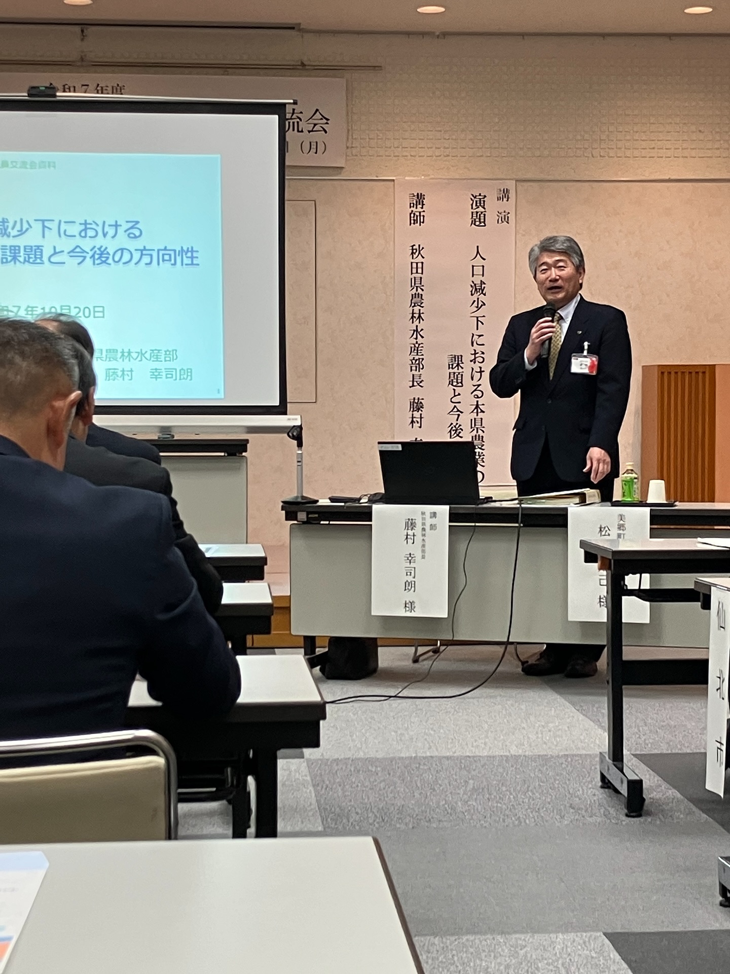 松田美郷町長の歓迎のあいさつの後、秋田県農林水産部部長の藤村幸司朗氏の「人口減少下における本県農業の課題と今後の方向性」と題した講演会を聞きました。