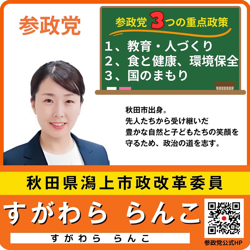 ホーム大仙市議会 潟上市政改革委委員 すがわららんこ です 2025/11/20 2025/12/01 SHARE 潟上市政改革委委員 すがわららんこ です ツイート シェア はてブ Google+ Pocket LINE すがわららんこ。 彼女の若さと行動力が、潟上市をきっと変えてくれる! #すがわららんこ #潟上市 #参政党 ★ 自給自足を目指して養鶏を始めました。 雪にも耐えられる鶏小屋を自力で建てました。鳥骨鶏やひよこの様子をyoutubeにアップしていますので、見てね。 秋田弁チャンネル ブログトップはこちら ブログランキング参加中 にほんブログ村 フォーローはこちら コメントを残す コメントをキャンセルメールアドレスが公開されることはありません。 ※ が付いている欄は必須項目ですコメント ※ 名前 ※ メール ※ サイト 次回のコメントで使用するためブラウザーに自分の名前、メールアドレス、サイトを保存する。 上に表示された文字を入力してください。