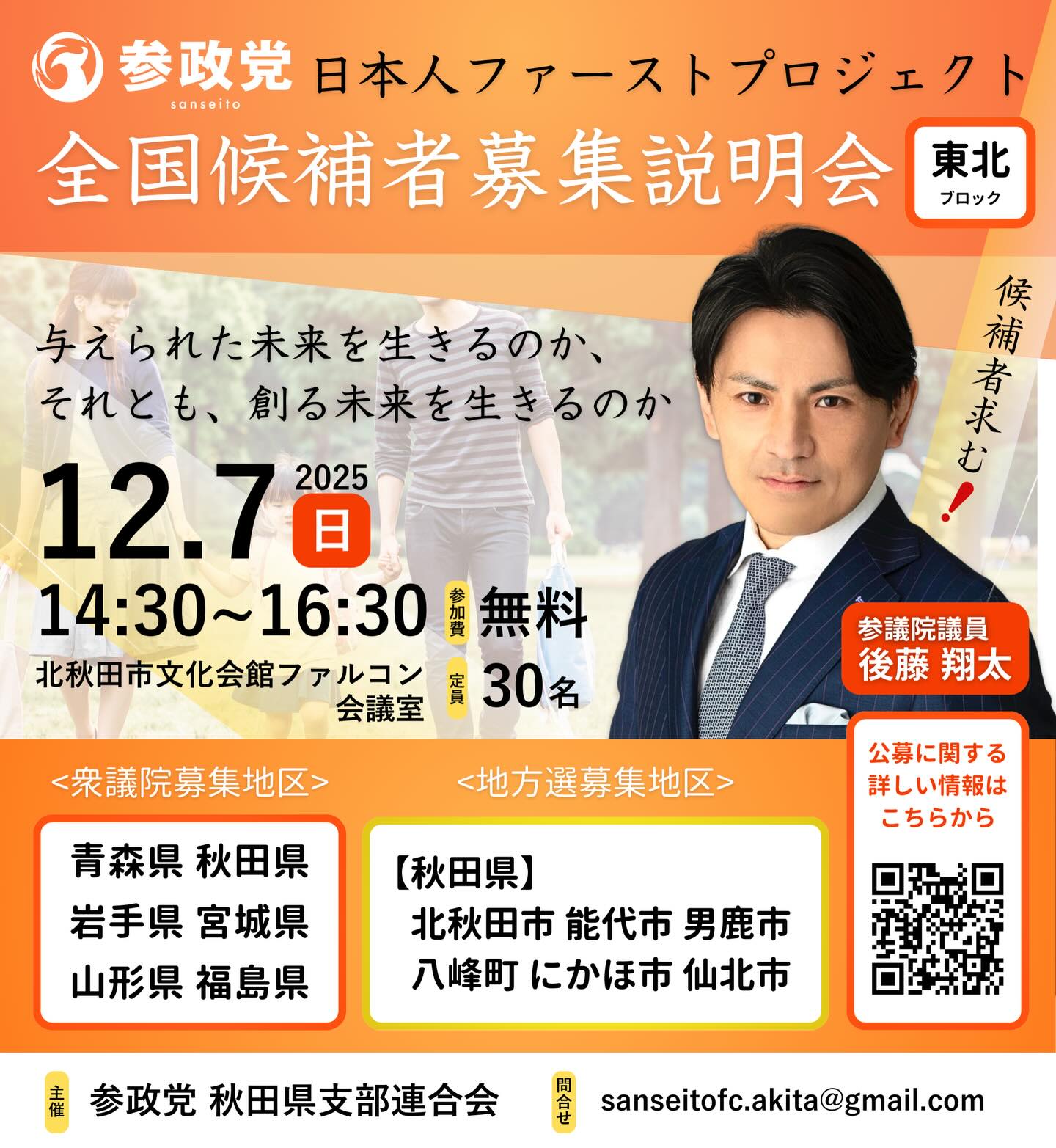 秋田で参政党から衆議院選挙、地方選挙への立候補を検討している方は、ぜひ候補者説明会へご参加ください。