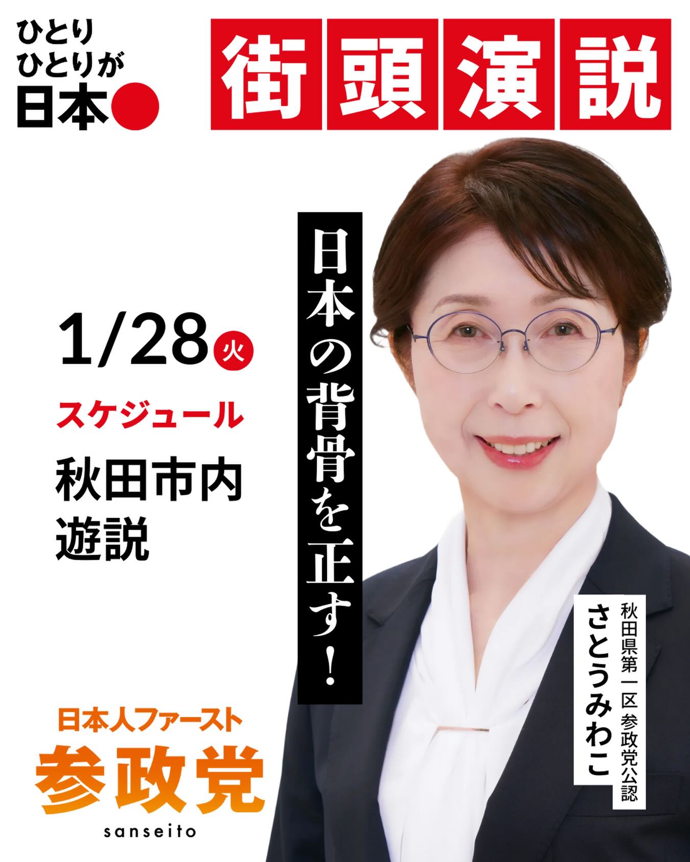 Homepage参政党 ITSUKO 2週間 ago Categories: 参政党 さとうみわこ 秋田1区 衆議院に立候補 参政党公認 さとうみわこ 2026年1月27日 衆議院議員選挙に突入です! 私は視察旅行で行けませんでした。 秋田から参政党の国会議員を誕生させたい。 全力で応援します! さとうみわこ の応援に行ってきました » « 大仙市議会 教育厚生委員会視察旅行 Tags: 参政党さとうみわこ秋田1区 ITSUKO: 高齢の母のため秋田県大仙市の実家に移住。元ニットデザイナー。NHKのすてきにハンドメイドに出たり、手芸本に作品を提供していました。実家は仙北農園。アスパラガス・米をなどを栽培しています。今、私は自然栽培や養鶏に挑戦しています。 2018年乳がん発症。両足人工股関節。 2025年10月より、大仙市議会議員。 カザフスタンの歌手 ディマシュ クダイベルゲン dimash のファンです。 コロナウイルスをきっかけに世界情勢に目覚めました。日本大好き。美しい日本を守りたい。参政党で活動しています。 くわしいプロフィールはこちらです。 トップはこちら Leave a Comment Related Post さとうみわこ の応援に行ってきました すがわららんこ 潟上市 出陣式
