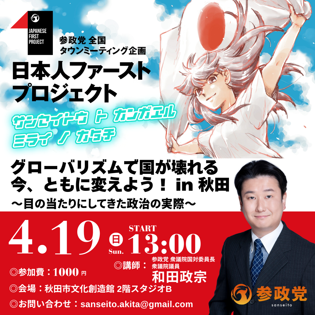 Homepage参政党 ITSUKO 3時間 ago Categories: 参政党 4月19日 秋田市でタウンミィーテイング 秋田市でタウンミィーティング開催。 和田政宗氏が「グローバリズムで国が壊れる今、ともに変えよう!」というお話をしてくださいます。 党員でない方の参加、大歓迎です! お申込みはこちらから o5gqg.hp.peraichi.com #ファースト参政党 #和田政宗 « 立て看板設置 Tags: 参政党参政党タウンミィーティング和田政宗 ITSUKO: 高齢の母のため秋田県大仙市の実家に移住。元ニットデザイナー。NHKのすてきにハンドメイドに出たり、手芸本に作品を提供していました。実家は仙北農園。アスパラガス・米をなどを栽培しています。今、私は自然栽培や養鶏に挑戦しています。 2018年乳がん発症。両足人工股関節。 2025年10月より、大仙市議会議員。 カザフスタンの歌手 ディマシュ クダイベルゲン dimash のファンです。 コロナウイルスをきっかけに世界情勢に目覚めました。日本大好き。美しい日本を守りたい。参政党で活動しています。 くわしいプロフィールはこちらです。 トップはこちら Leave a Comment Related Post 立て看板設置 3月の参政党秋田第3支部の勉強会&懇談会